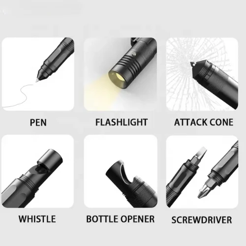 - Flashlight feature can defend, Tungsten tip feature can attack, Whistle feature can protect during emergencies